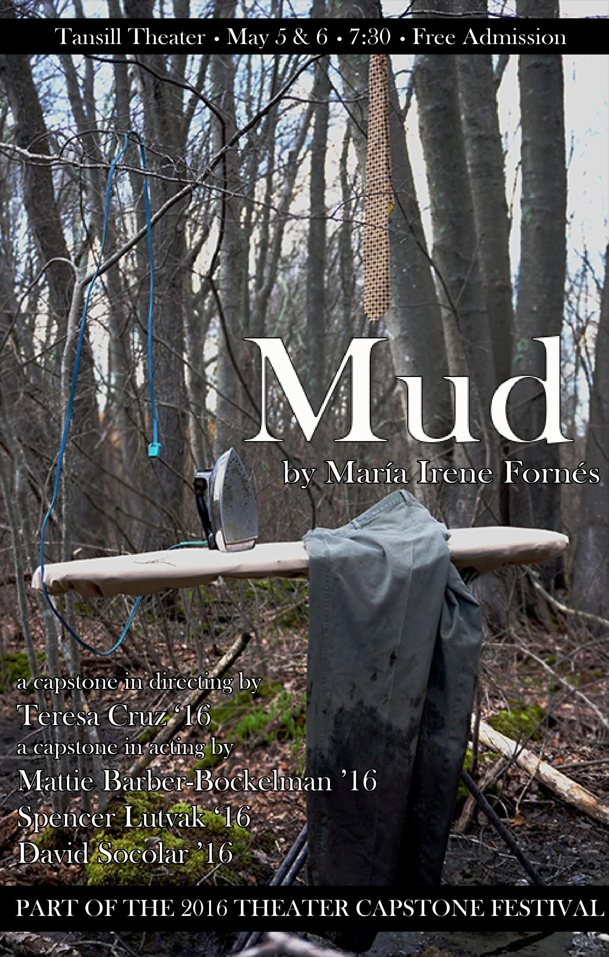 In Mud, Fornés writes in “white outs” at the end of each scene. Teresa, Mattie, David, and Spencer explored these and other stage pictures on stage using Action Theatre improv.